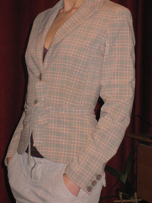 Конкретный жакет - без подклада. На жару - самое оно. Пуговки похожи на костяные. Карманчиков - 4 штуки. Сзади - встречная складка. Идеальный компаньон для всевозможных брюк и шортов. Вещь свободная, в силу особенностей кроя можно носить на очень приличный животик. А можно подобрать поясок - с ним будет даже лучше, на мой взгляд. Размер 2 на 42-44 полный. Куплено в США на закрытых распродажах с гигантской скидкой. Изначальная цена 330 долларов. В наших бутиках такая простота стоит тысяч 15 рублей. Пристрою за 1950.