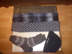 4. 2 шелковых и 1 теплый шарф, шерстяная шапка и носки. Состояние от удовлетворительного до хорошего.