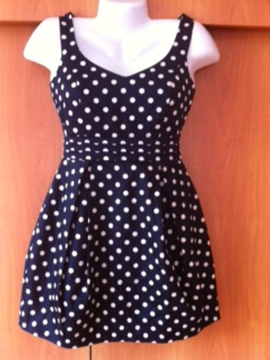 Продам платье в горошек, с сердце-образным вырезом на спине. Привезено из Англии. "New Look". Размер 40-42 (uk - 6). Талия 65см, под грудью 70см, длина от талии - 43см.
