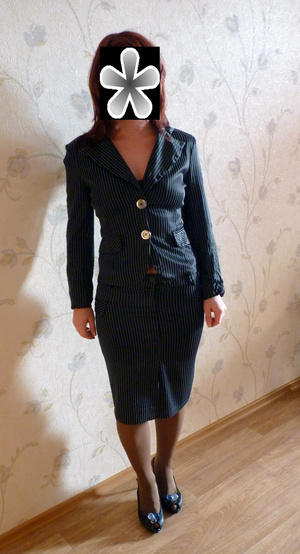 2. костюм черный в серебристую полоску. состояние очень хорошее. Размер 42-44. Цена 300 руб.