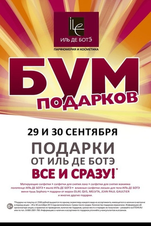 смс от Иль Де Боте: счастливые дни 23 и 24 августа при покупке от 2000р карта на 500р в подарок. 23 августа скидка 25% в честь дня рождения магазина на Красном пр.30.