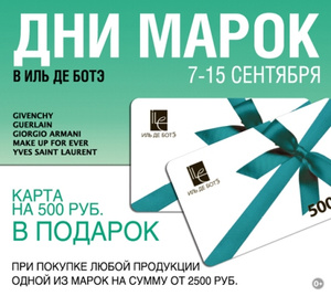 Как и прежде, в период проведения акции при покупке любой продукции одной из марок Givenchy, MAKE UP FOR EVER, Guerlain, Giorgio Armani, Yves Saint Laurent на сумму от 2500 руб вы получите карту на 500 руб в подарок!
