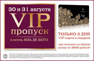 Только 30 и 31 августа 2013 года во всех ИДБ пройдет акция «VIP-пропуск в осень»! Только в течение 2-х дней при покупке товаров на общую сумму от 3000 рублей после применения скидок – в подарок VIP-карта ИДБ!