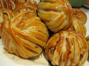Тесто раскатать и порезать на тонкие полоски, шириной не больше пол сантиметра. Полосками теста обмотать шарики, как клубок ниток. Желтки взбить и смазать ими готовые шарики. Противень посыпать мукой. Потом выложить шарики на противень и выпекать в течение 20-25 мин. при температуре 180° градусов.