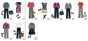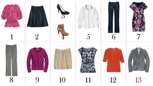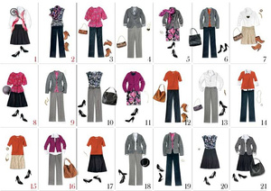 в моем 7 вещей, 2 пары обуви, 7 аксессуаром (сумки, браслеты, платки ). из этого набора легко создается (по примеру) 10 комплектов.