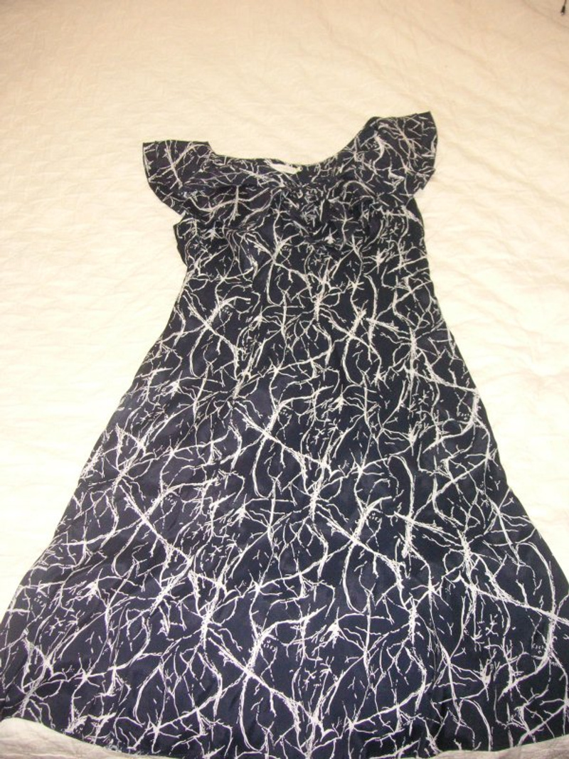 также на 44 (у него маркировка 46, но ОГ точно до 89-90см иначе не застегнется сбоку замок), ткань вискозная, легкая, но не тянется, в глажке не нуждается, очень хороший вариант на лето-отдых, не требует особого ухода, цвет темно-темно-синий с бежевым рисунком, длина также при 170 до колена, в талии оно свободновато, можно и с пояском носить, свой я для наглядности приложила, платье без пояса продавалось