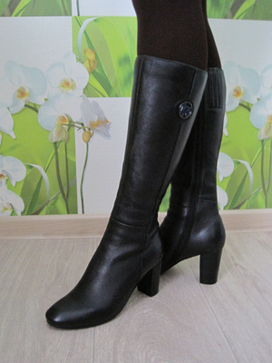 Сапоги демисезонные были привезены в подарок. Одеты один раз, поняла, что все же жмут. Размер указан 37, но скорее 36-36,5, может быть и 37, но на очень узкую ногу. Высота голенища 35 см, обхват 34 см, высота каблука 7,5 см. Цена 1000 руб.