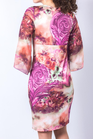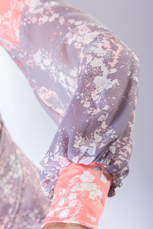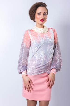 Женственное платье полуприлегающего силуэта в нежной цветовой гамме. Имитация блузки и юбки. Блузка с запахом отлетная по переду. Верхний срез юбки переда собран на резинку, что обеспечивает более удобную посадку по фигуре. Рукава выполнены из полотна шифон, по низу рукавов - манжеты.