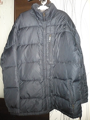 3. Пуховик «Nike» тёмно-синего цвета. Носили пару сезонов, поэтому есть потертости по низу и рукавам (краям).Р-р. М, но думается, что это L. 300 руб.