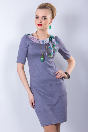 Весеннее платье прилегающего силуэта из однотонного полотна. Круглая кокетка горловины выполнена из полотна "шифон" с небольшой драпировкой, украшена широким бантом. Изделие дополнено декоративными отстрочками.