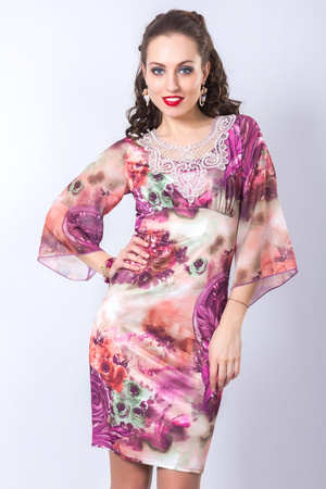 Изящное платье полуприлегающего силуэта с круглым вырезом и втачными широкими рукавами. Отрезная кокетка дополнена сборками и украшена декоративным элементом. Рукава выполнены из полотна шифон.