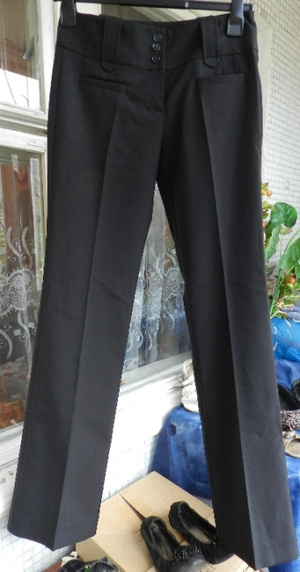 3.Черные прямые брюки на холодное время года. Ткань плотная, черная с небольшим добавлением блеска.Привезены из Германии. Размер 44. Цена - 200