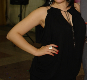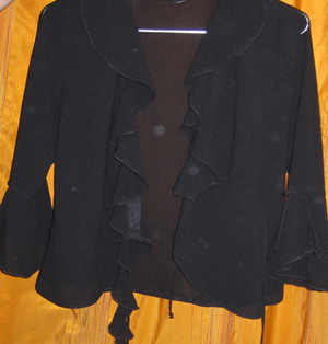 1. Черная шифоновая блузка с запахом. Рукав 3/4 клешёный, рюши, завязки. Одета один раз. Р-р. - 42-44. Цена - 100 руб.
