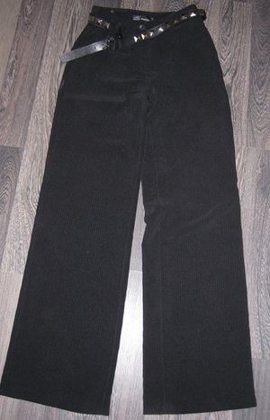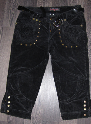 4. Черно-коричневые вельветовые бриджи (на фото блики). Заклёпки, фигурная вышивка и выбивка. Р-р 42-44, пару раз носились. ПОБ - 46-47 см, ПОТ - 37 см, длина по наружному шву - 64 см. Цена - 100 руб.