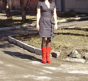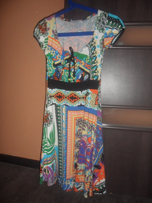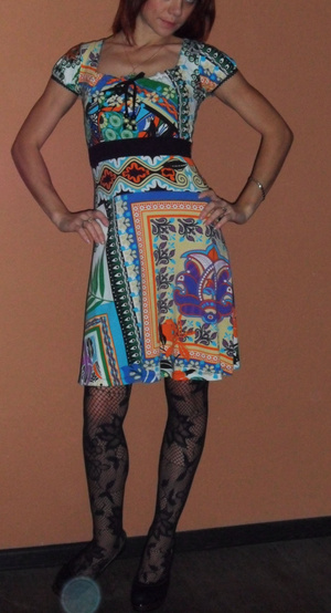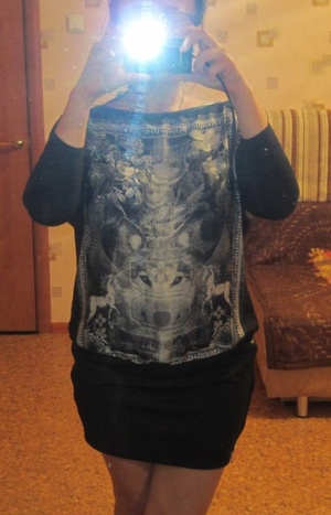 - Платье Berschka c рисунком волка спереди. Рукава наполовину трикотажные, в пройме расклешенные, с середины трикотаж в обтяжку. По низу платье отрезное трикотажное, с замками по бокам. Размер 44-46. Цена 1000 руб.