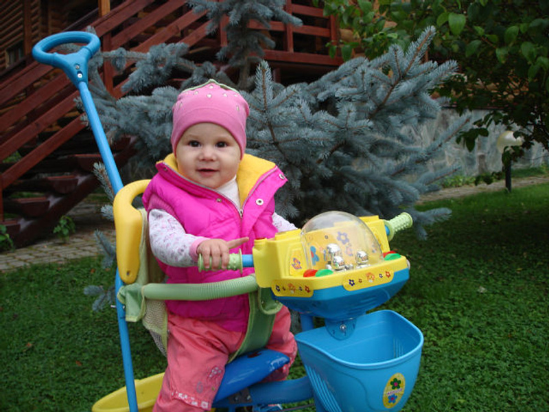 я выше писала, мы в велосипед пересели в 1,5. Сразу как лето пришло (мы ноябрьские). в коляске сидеть особо уже и не хотели. А в велосипеди и руль и музыка играет