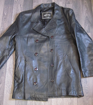 2. Куртка кожаная двубортная, р-р 48-50. Можно носить как пиджак. Плечи - 50 см (от шва до шва), ДИ - 87 см, Д рукава - 61 см, ОГ по подмышкам - 55-56 см, 500 руб.