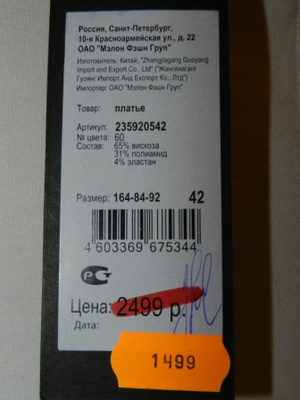 На этикетке цена - 680 долларов. В России платья этого бренда стоят от 60 тысяч рублей. Продам за 6 тысяч рублей.