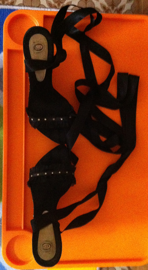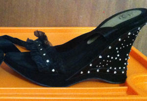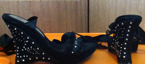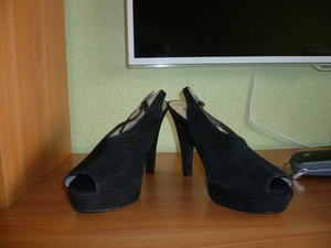 1. Босоножки (женские)) размер 38,5 (замерю по стельке если нужно). Натуральная замша, украшены стразинками, не пошлые, на лентах атласных, на танкетке. Одеты раза два-три, не мой стиль.
