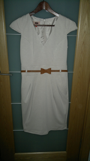 Платье Некст, р-р 44-46 (граничит), бежевое с ремешком, с карманами, по фигуре, 1500.