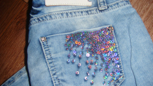 На задних карманах декоративные молнии, цвет классический голубой.