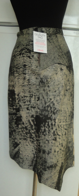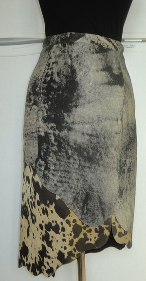 Новая кожаная юбка из двух видов кожи - серой пятнистой гладкой и желтоватой пятнистой же с ворсинками. На подкладе. подол неровный. Размер 40-42 российский. Замеры: талия 64-65, бедра 93 см. Максимальная длина 78 см, минимальная (там, где разрез) - 48 см. Качество отличное. Куплена за рубежом с большой скидкой. Немного по размеру не подошла. 2600