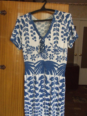 Платье летнее белое с синим узором, на поясе вшиты утягивающие резинки, длина ниже колена при росте 160, 44 размер, при узкой талии подойдет на 46, 250 рублей