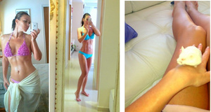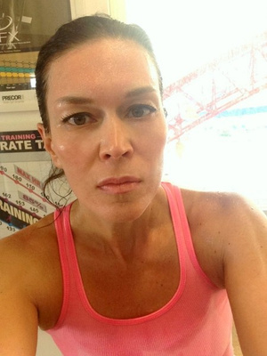 как будто человек что-то пережилгде в розовом топике-это после усиленной тренировки. если цитировать из блога, то она выползла с тренировки и мокрая как из душа
