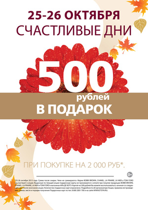 *При покупке от 1000 рублей без учета скидок по дисконтным картам покупатель получает в подарок сертификат номиналом 500 рублей, равным 50% стоимости покупки на сумму от 1000 рублей.
