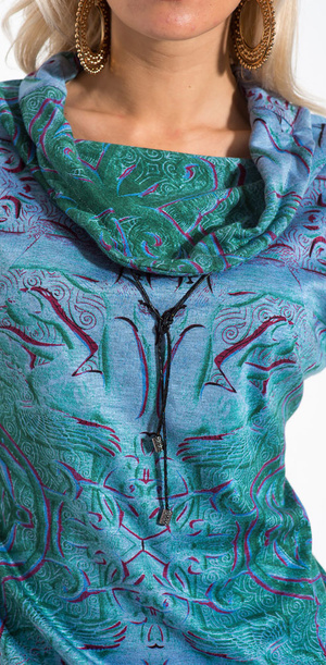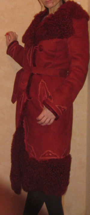 Цвет глубокий красно-бордовый, отделка шкурками овчины. На поясе.