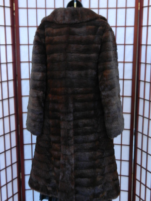 Продам шикарную американскую винтажную норковую шубу в прекрасном состоянии, нуждается только в химчистке и, возможно, полировке меха (он ни разу не чистился, поэтому не помешает, будет блестеть после этого). Очень качественно сшита из горизонтальных полос темно-коричневой норки, тэгов фабричных нет, видимо, шилась на заказ. Красивый к низу расширяющищийся фасон-годе, воротник -стойка. Подойдет на размер 42-44 и лучше не самый маленький рост.