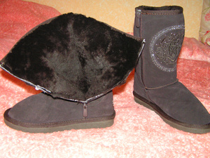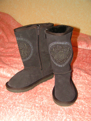 2. Угги натуральные НОВЫЕ, р. 36-37, цвет - шоколад, спереди вышивка, украшенная металлическими стразами. Дополнительно вшит замок! Очень актуально для ножек с высоким взъемом! /вшивала на подарок в 2 пары, эта пара не подошла/ 2400р.