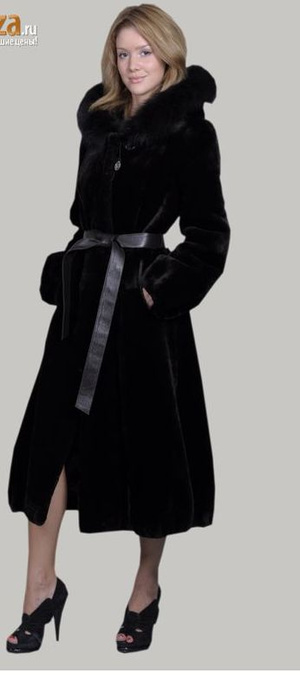 Силуэт полуприлегающий. Капюшон отделан пушниной чернобурка.Смотрится красиво,дорого.Рукава и низ изделия присборены. Пояс из кожи (не блестящий), завязывается. Застежка на крючках.