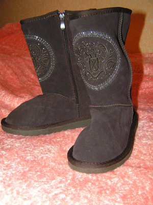2. Угги натуральные НОВЫЕ, р. 36-37, цвет - шоколад, спереди вышивка, украшенная металлическими стразами. Дополнительно вшит замок! Очень актуально для ножек с высоким взъемом! /вшивала на подарок в 2 пары, эта пара не подошла/ 2400р.