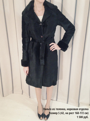 2. Пальто из теленка, норковая отделка на воротнике и рукавах. Мех на поясе очень потертый, рекомендую заменить на другой ремень, но продаю, как и покупала: комплектом. Из магазина СТД на Вокзальной магистрали, стоило 12 000. Размер S (42, рост 168-172 см), 1 500 руб.