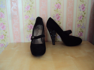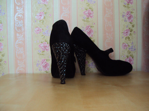 Туфли. Чёрная замша. На каблуках нет нескольких стразин. Р-р 39. можно и на 38 р-р мерить. Отдам за вкусняшки, или ваша цена...