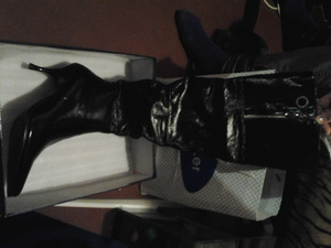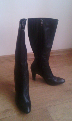 Продам новые женские осенне-зимние сапоги. Размер 38, небольшой каблук (от 5 см), натуральная лаковая кожа. Цвет черный. Высота голенища - на ладонь выше колена.
