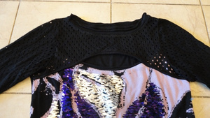 2. Кофта 46 размер, длина 87 см, верх и рукава в сеточку, спина полностью черная,вживую чуть ярче, чем на фото.(состав 82% вискоза,15% полиамид,3% эластан) Очень приятная к телу, не колется .