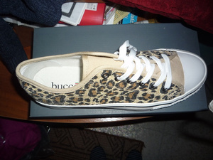 1.Кеды Bucco, текстиль, очень удобные внутри, платформа 3 см, поверху нашиты прозрачные пайетки, расцветка леопард. Большемерки 41-42 , по стельке внутри 27,5 см . цена 1100 руб