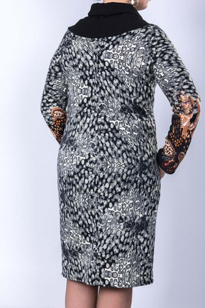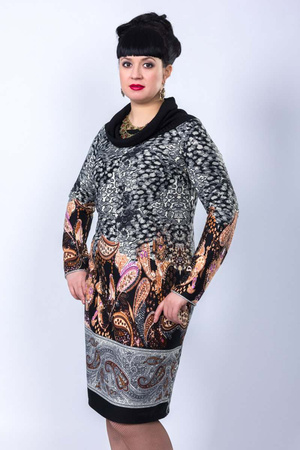 Теплое элегантное платье прямого силуэта из плотного трикотажного полотна с купонным рисунком. Широкий воротник «хомут» выполнен из полотна «лапша».