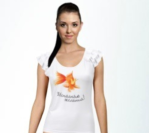 Футболка с золотой рыбкой (надпись "Исполняю желания"), рукава-крылышки, хлопок. Цвет белый, цена 350 р. Размер М (российский 46)