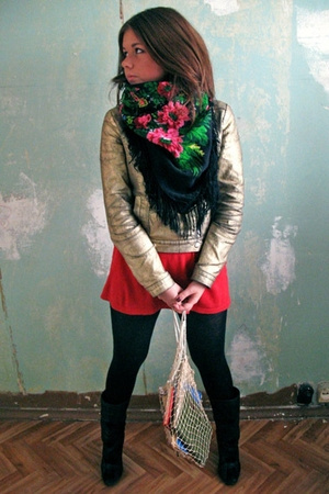 Платок (бордовый в цветах) я ношу с джинсовой курткой.