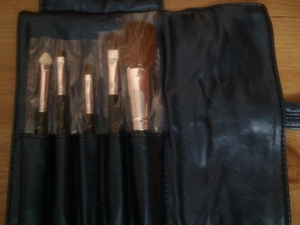 Набор косметических кистей для макияжа в мягком чехле из иск. кожи на завязках. Внутри: 5 кистей (4 из натурального волоса и 1 спонж на длинной ручке). 400 рублей.