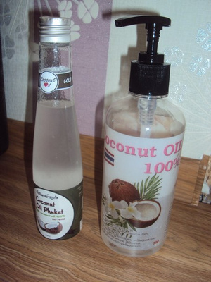 2.Натуральное кокосовое масло из Тайланда!600 р за все(в большом бутыльке половина осталась,маленький почти полный-нерафинированное 100 % натуральное!!!)