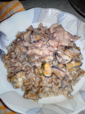 Ужин - гречка с морепродуктами и зеленый чай.