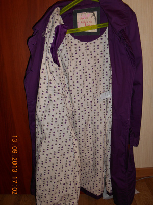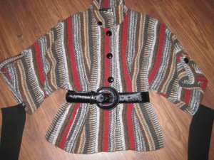 Курточка из буклированного драпа р-р 46 за 300 руб. Рукава 3/4, но пристёгиваются трикотажные чулки-рукава. Широкий лаковый пояс в комплекте.
