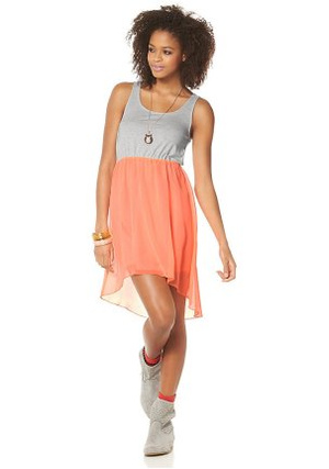 Новое платье AJC, размер 44. Притачная юбка из шифона, на подкладке. Эластичная вставка на талии. Модный асимметричный покрой. Длина спереди ок. 84 см, сзади - ок. 100 см. Материал: 64% полиэстер, 32% вискоза, 4% эластан; вставка из шифона и подкладка, 100% полиэстер. Цена 900.