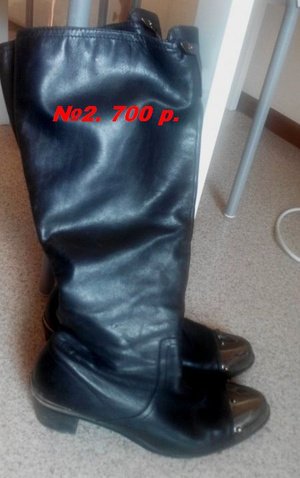 №2. Демисезонные сапоги D.Bigioni, маркировка 40, но идут на полноценный 41, натуральная кожа, внутри байка. Нос декорирован железной вставкой. На широкую ножку подойдут. На одном каблуке сзади косячок (содрано). Замеры: по стельке 27, каблук 6, высота голяшки (сзади) 39, ширина голяшки 19. 1500 р. 700 р.