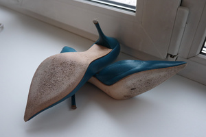 Туфли красивого бирюзового цвета (на коробке написано - синий), по цвету идеально подходят к платью. Стильные и удобные. Одеты были раза 4 ненадолго, но т.к. кожа мягкая, следы от носки присутствуют.