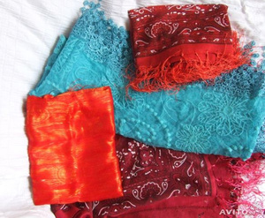 Продам яркие, легкие шарфики из Тайланда, с бахромой. 5 штук: красный 2 оттенка, красно-оранжевые, бирюзовый, голубой. Цена 200 рублей за шарфик, или 800 рублей за все сразу.